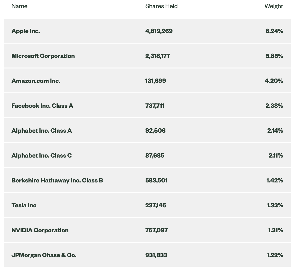 SPLG는 S&P 500 성장기업에 투자하는 ETF로서 애플 6.24%, 마이크로소프트 5.85%, 아마존 4.20%, 페이스북 2.38%, 구글 A 2.14%, 구글 C 2.11%, 버크셔 해서웨이 1.42%, 테슬라 1.33%, 엔디비아 1.31%, 제이피모건체이스 1.22%를 차지하고 있으며 Top10종목이 전체의 약 28%를 차지하고 있습니다.