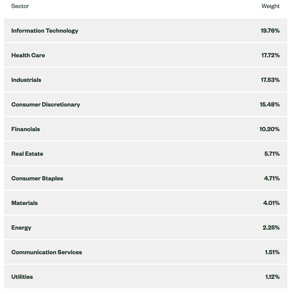 MDYG ETF 투자섹터로는 정보 기술 20.16%, 산업재 19.39%, 보건 의료 17.49%, 임의 소비재 16.53%, 금융 8.42%, 부동산 5.62%, 재료 5.14%, 소비재 2.82%, 통신 서비스 2.30%, 에너지 1.49%, 유틸 0.64%를 차지하고 있습니다.
