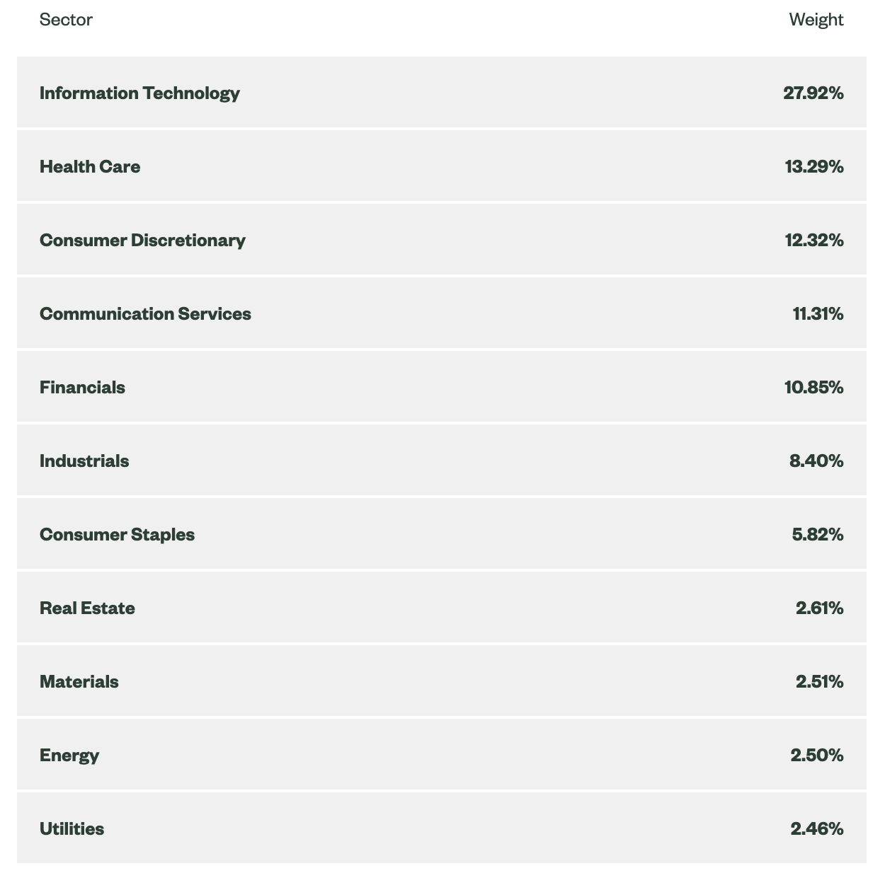 SPLG 투자섹터로는 정보 기술 27.92%, 건강 의료 13.29%, 임의 소비재 12.32%, 통신 서비스 11.31%, 금융 10.85%, 산업재 8.40%, 소비재 5.82%, 부동산 2.61%, 재료 2.51%, 에너지 2.50%, 유틸 2.46%를 차지하고 있습니다