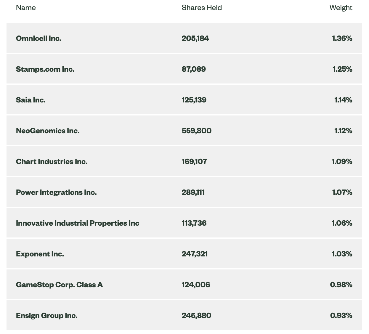 SLYG는 중형기업 성장 부분에 투자하는 ETF로서 Omnicell Inc 1.36%, Stamps.com.Inc 1.25%, Sala Inc 1.14%, NeoGenomics Inc 1.12%, Chart Industires Inc 1.09%, Power Integrations Inc 1.07%, Innovative Industrial Properties Inc 1.06%, Exponent Inc 1.03%, GameStop Corp. Class A 0.98%, Ensign Group Inc 0.93%를 차지하고 있으며 Top10종목이 전체의 약 11%를 차지하고 있습니다.